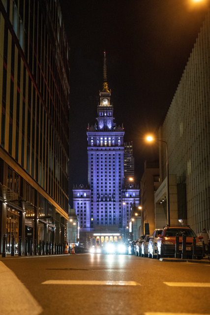 Palais de la Culture et de la Science illuminé la nuit