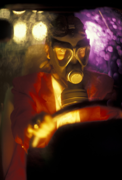Personne en masque à gaz conduisant dans des lumières vaporeuses