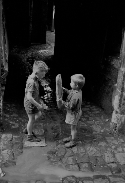 Enfants jouant avec une baguette dans une ruelle pavée