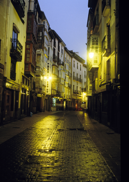 Rue pavée entre immeubles au crépuscule