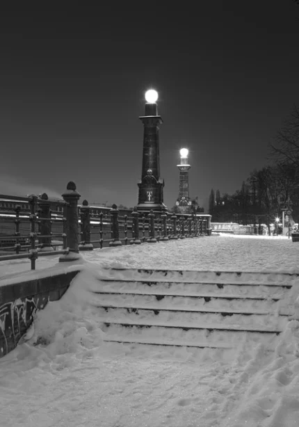 Escaliers enneigés et réverbères lumineux la nuit