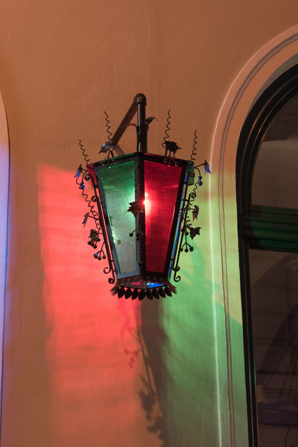 Lanterne en verre coloré éclairant un mur