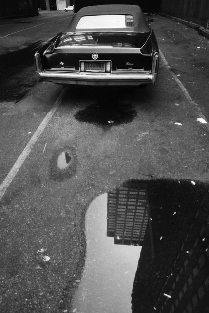 Voiture classique avec reflet de bâtiment dans une flaque d’eau