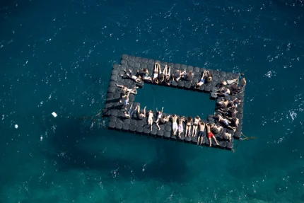 Groupe de jeunes sur un radeau flottant dans l’océan