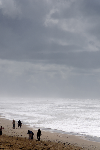 Plage venteuse avec des promeneurs sous un ciel nuageux