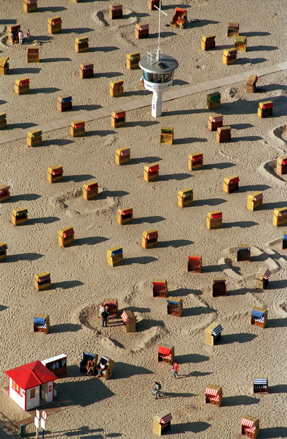 Plage avec cabines colorées et tour de surveillance.