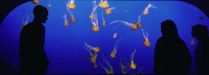 Silhouettes admirant des méduses dans un aquarium