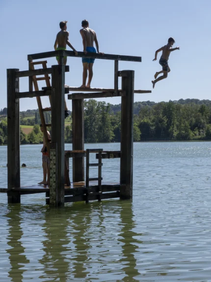 Saut d’enfants dans un lac depuis une structure en bois