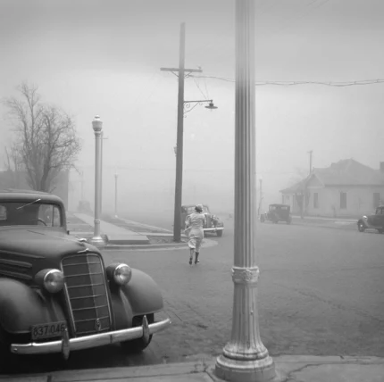 Rue dans la Brume avec Voiture Ancienne et Personne