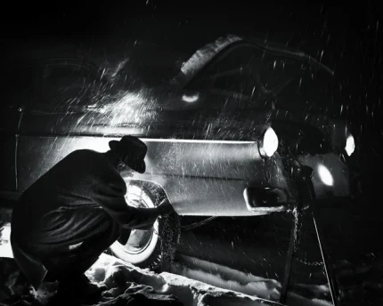 Réparation d’une voiture sous la neige nocturne