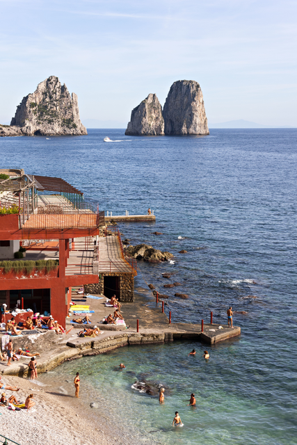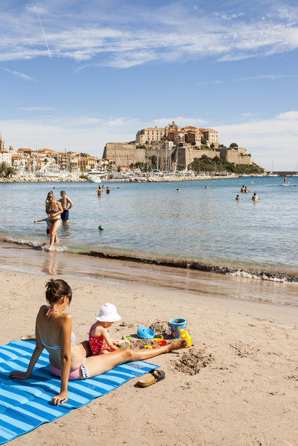 Plage méditerranéenne avec forteresse et famille