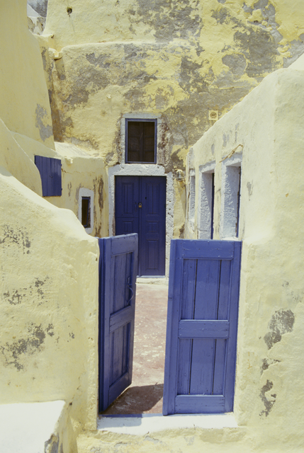 Portes bleues et murs jaunes dans une ruelle méditerranéenne