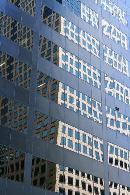 Reflet d’un bâtiment dans une façade en verre