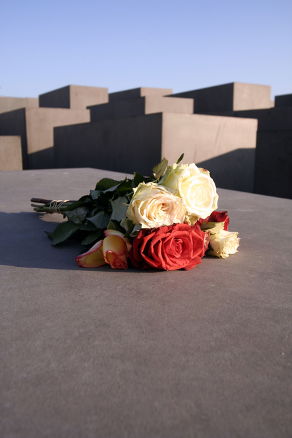 Bouquet de roses sur monument en béton