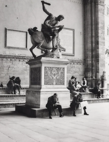 Place publique avec sculpture classique et passants