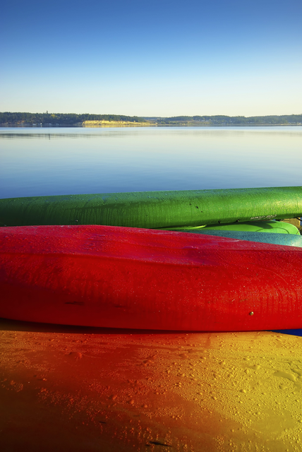 Canoës colorés au bord d’un lac tranquille