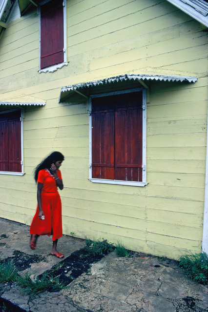 Femme en robe rouge devant une maison en bois