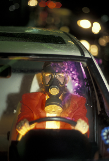 Femme portant un masque à gaz au volant d’une voiture la nuit