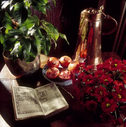 Nature morte avec livre, grenades, pot en laiton et plantes