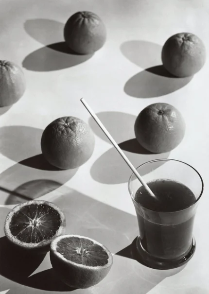 Verre de Jus d’Orange avec Oranges Complètes et Coupées en Noir et Blanc