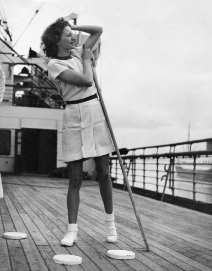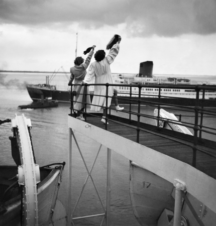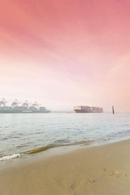 Bâtiment orange sur une île avec un navire en arrière-plan