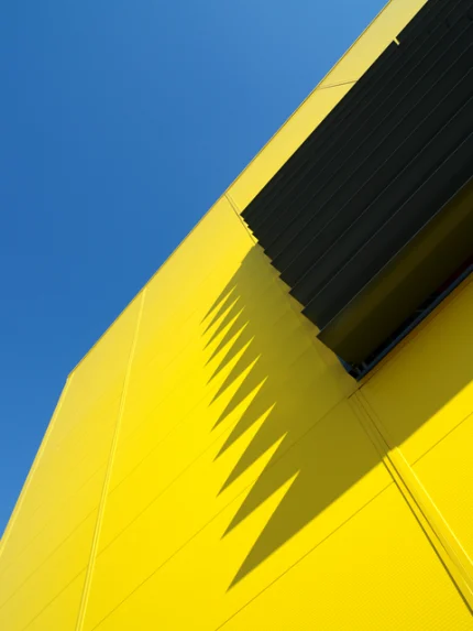 Architecture moderne avec ombres géométriques sur un bâtiment jaune
