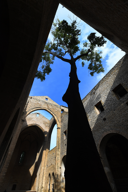 Arcades en pierre d’un cloître médiéval avec jeu de lumière