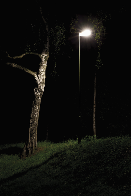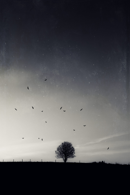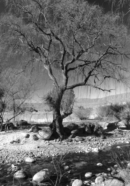 Arbre solitaire près d’un ruisseau en noir et blanc