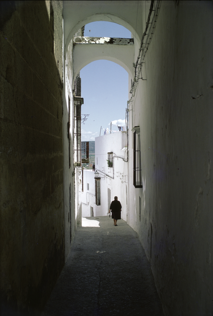 Porte en arcade d’une ruelle étroite avec une femme marchant au loin