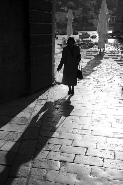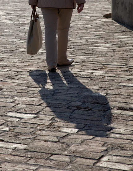Femme âgée marchant dans une ruelle pavée en lumière du jour