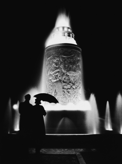 Silhouettes devant une fontaine illuminée de nuit