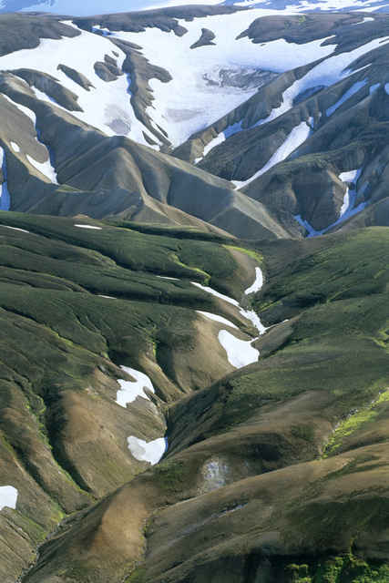 Vallée montagneuse avec neiges éternelles et rares zones verdoyantes