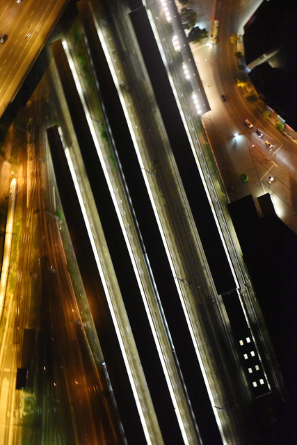 Vue aérienne de nuit d’une gare ferroviaire avec routes illuminées adjacentes