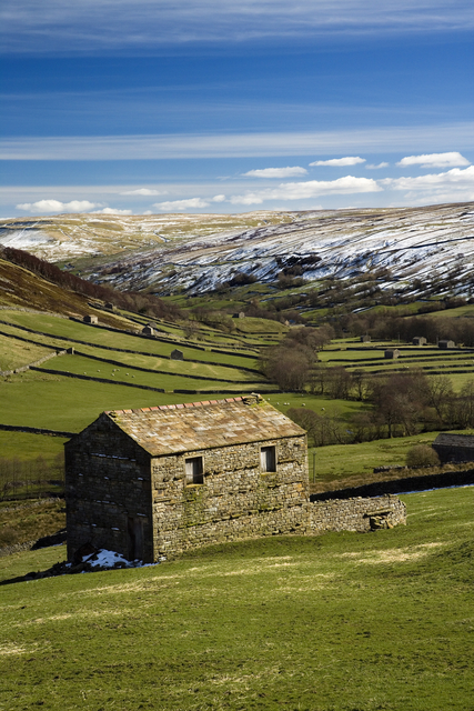 Vieille Grange en Pierre dans la Campagne avec Collines Enneigées