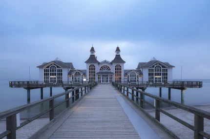 Ponton et bâtiment au bord de la mer au crépuscule