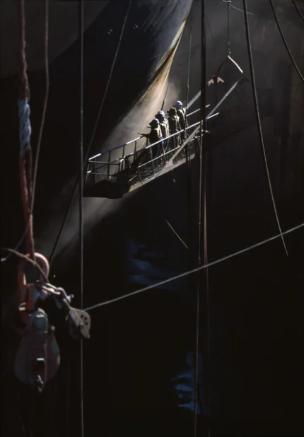 Travailleurs sur une passerelle dans un chantier naval sombre