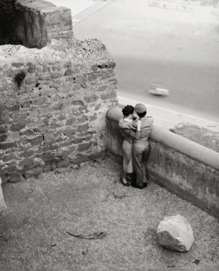 Couple s’enlaçant près d’un mur de pierres
