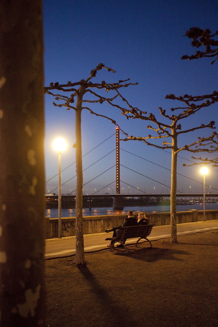 Couple assis sur un banc devant un pont illuminé au crépuscule