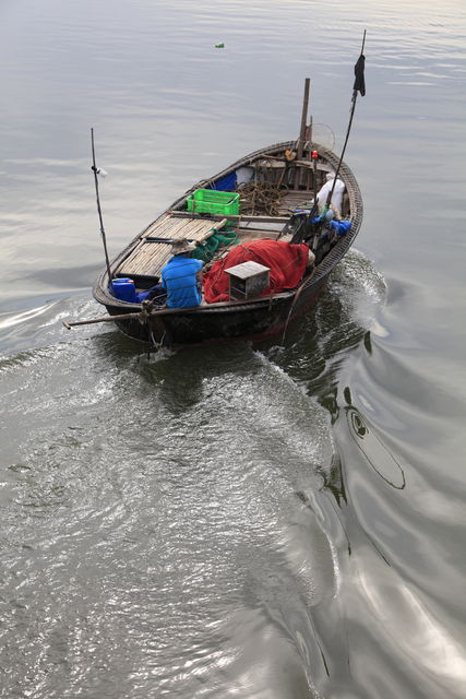 Pêcheur asiatique au crépuscule sur un lac tranquille