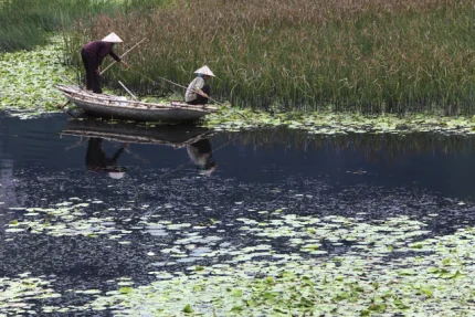 Pêcheurs dans une Pirogue sur un Étang