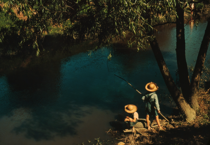 Pêcheur et enfant au bord d’une rivière