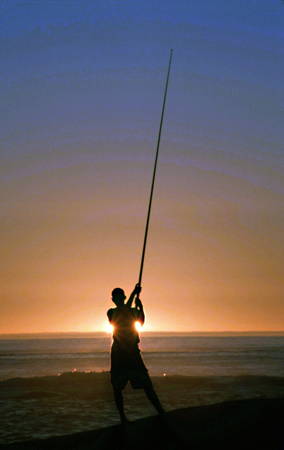 Pêcheur au coucher du soleil sur la plage