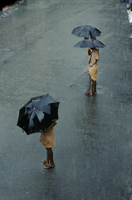 Deux personnes avec parapluies sur une route mouillée