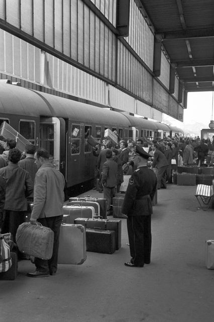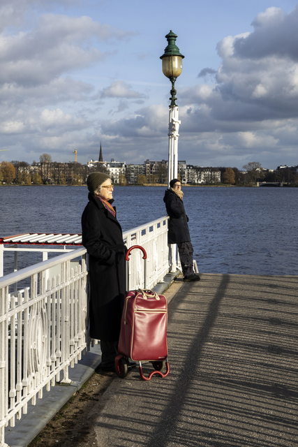 Deux personnes se tenant sur un quai avec une valise rouge par une journée ensoleillée