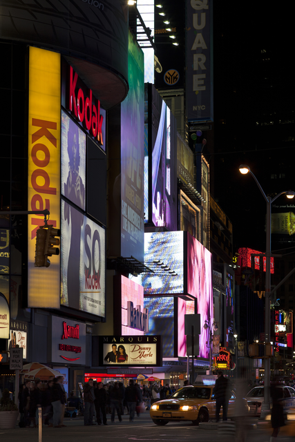 Affiches lumineuses et circulation nocturne dans une rue animée