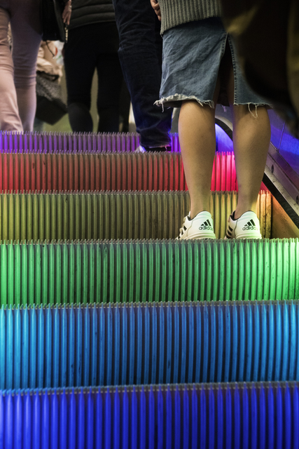 Escalator lumineux avec des personnes montant.