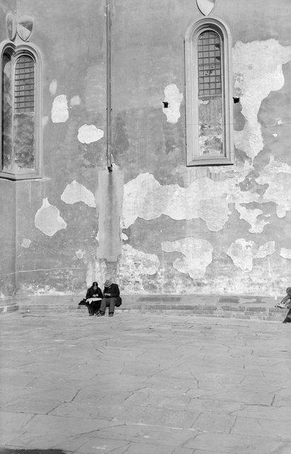 Deux personnes assises contre un mur usé