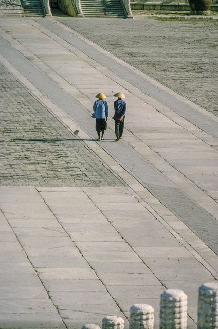 Deux personnes en tenue traditionnelle marchant sur une avenue pavée