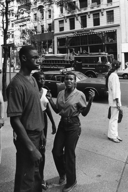 Scène de rue avec plusieurs personnes et véhicule de pompier en arrière-plan
