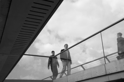 Gens marchant sur un pont moderne